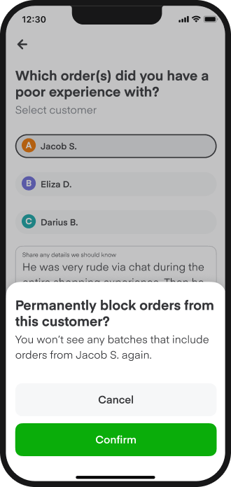 Your experience on the platform is important to us — it helps us ensure we build a fair, considerate and compassionate community. You can now let us know how each batch went using the post batch survey. If you have a bad experience with a customer, you’ll now be able to block future orders from this customer in the app.